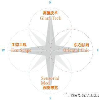 歐洲在北南西東方向的設(shè)計(jì)特質(zhì)在當(dāng)代的最新表現(xiàn)可以分別抽象出高雅技術(shù)、視覺博覽、生態(tài)主線和東方時(shí)尚等四個(gè)關(guān)鍵詞,見圖1所示。