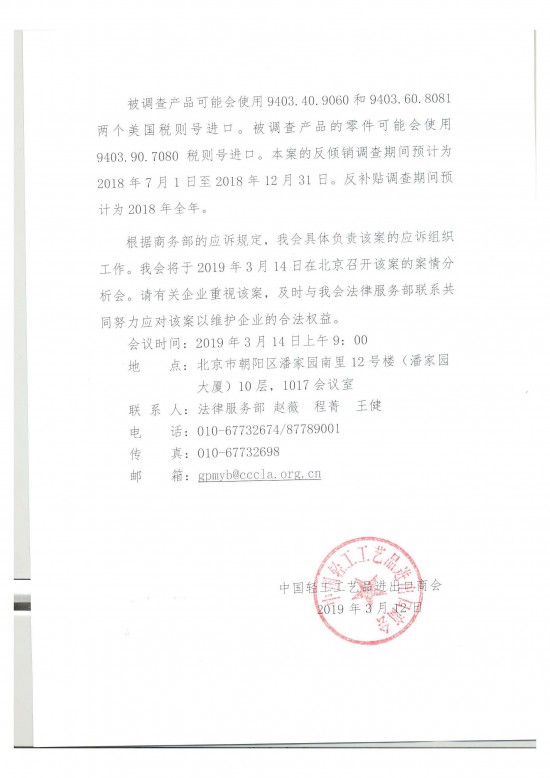 根據(jù)商務(wù)部的應(yīng)訴規(guī)定,我會具體負責(zé)該案的應(yīng)訴組織工作。我會將于2019年3月14日在北京召開該案的案情分析會。請有關(guān)企業(yè)重視該案,及時與我會法律服務(wù)部聯(lián)系共同努力應(yīng)對該案以維護企業(yè)的合法權(quán)益。