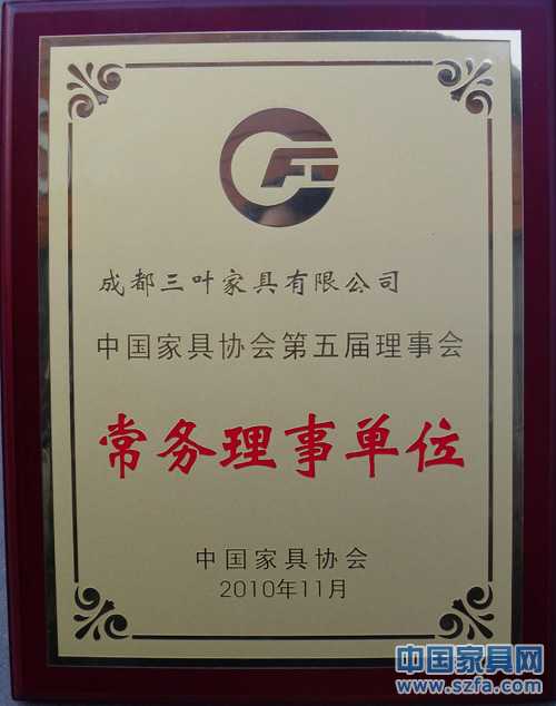 證書介紹 2010年11月,中國家具協(xié)會正式授予成都市三葉家私有限公司“中國家具協(xié)會第五屆理事會常務(wù)理事單位”! 證書圖片 |
