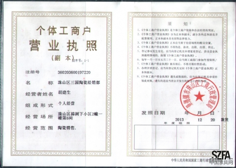 | 發(fā)證機(jī)構(gòu): | 江西省景德鎮(zhèn)市珠山區(qū)工商行政管理局 | 發(fā)證時間 : | 2012-12-20 |