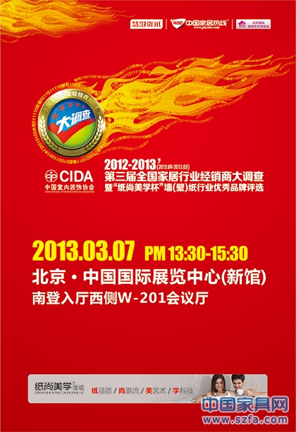 2013年3月7日下午13:30-15:30,2012-2013’第三屆全國家居行業(yè)經(jīng)銷商大調(diào)查暨“紙尚美學(xué)”杯墻(壁)紙行業(yè)優(yōu)秀品牌評(píng)選頒獎(jiǎng)典禮在北京·中國國際展覽中心(新館)W201會(huì)議廳隆重舉行,500余名墻紙經(jīng)銷商及廠家代表參加盛會(huì),中國室內(nèi)裝飾協(xié)會(huì)領(lǐng)導(dǎo)、房地產(chǎn)業(yè)協(xié)會(huì)領(lǐng)導(dǎo)出席典禮并為獲獎(jiǎng)品牌頒獎(jiǎng)。