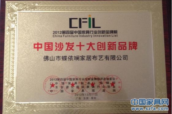 2012年12月11日,由《中國(guó)家具報(bào)道》發(fā)起,攜手《中國(guó)家具報(bào)道網(wǎng)》、《中國(guó)家具論壇網(wǎng)》聯(lián)合主辦的2012第四屆中國(guó)家具行業(yè)創(chuàng)新高峰論壇暨創(chuàng)新金牌榜頒獎(jiǎng)典禮在東莞盛大舉行,來(lái)自全國(guó)家具行業(yè)的數(shù)百精英聚集一起共商家具業(yè)創(chuàng)新發(fā)展之策,廣東蝶依斕沙發(fā)繼2009年、2011年被評(píng)為中國(guó)沙發(fā)十大創(chuàng)新品牌后再次上榜“中國(guó)沙發(fā)十大創(chuàng)新品牌”。