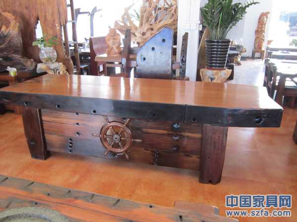 船木家具的氣度不凡,超過平常實木家具三至十倍的實木用料,取材自廢舊船身,而且把這些材料的本來面目毫無掩飾地、充分地展示出來,再加上科學(xué)的合理設(shè)計,上面的石板可以自動加熱,是古雅軒船木家具廠自己研發(fā)