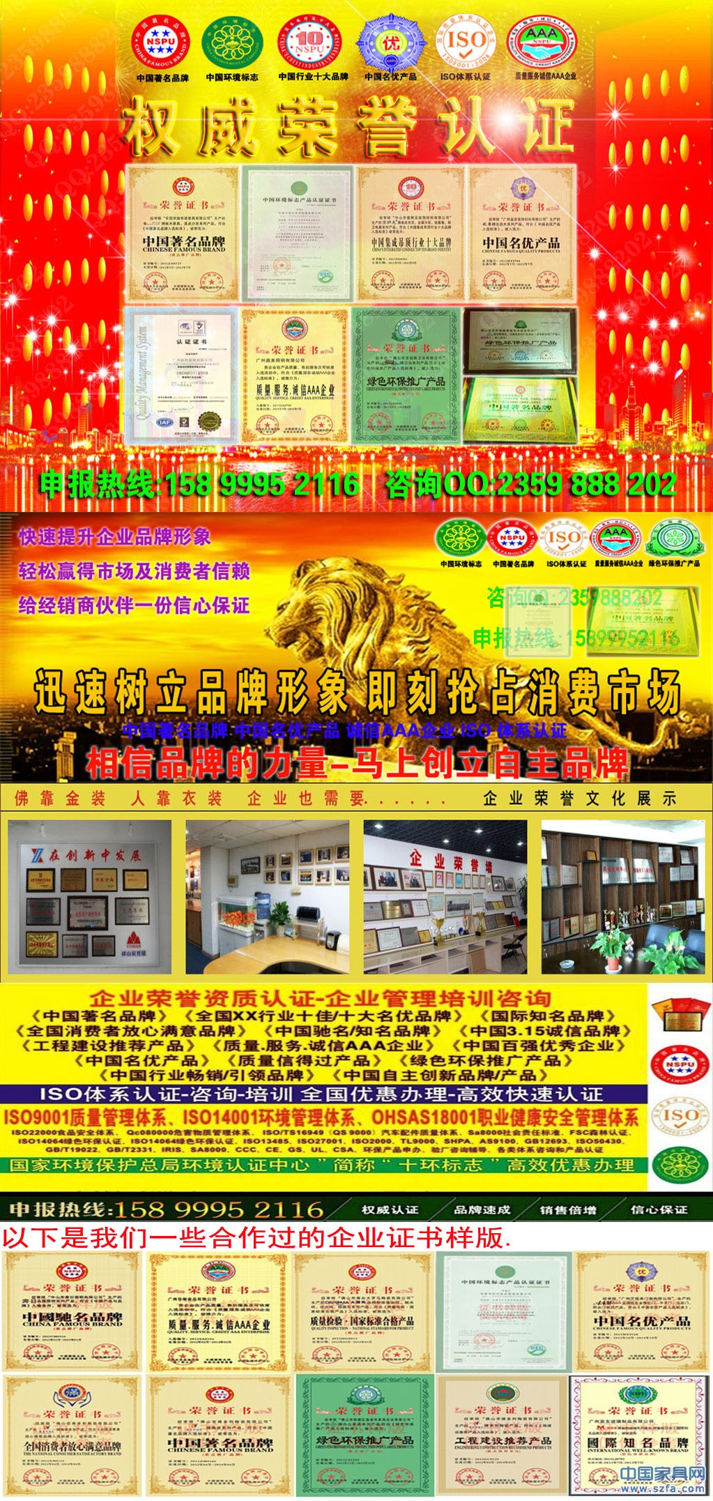 國(guó)家權(quán)威機(jī)構(gòu)認(rèn)證申辦:《中國(guó)著名品牌》《中國(guó)名優(yōu)產(chǎn)品》《質(zhì)量信得過(guò)產(chǎn)品》《全國(guó)XX行業(yè)十佳名優(yōu)品牌》《質(zhì)量.服務(wù).誠(chéng)信AAA單位》《全國(guó)消費(fèi)者放心滿意品牌》《綠色環(huán)保推廣產(chǎn)品》《中國(guó)工程建設(shè)推薦產(chǎn)品》《國(guó)際知名品牌-中英版》《廣東省名牌產(chǎn)品》《廣東省著名商標(biāo)》《中國(guó)環(huán)境(十環(huán))標(biāo)志》各項(xiàng)ISO環(huán)境體系認(rèn)證CCC認(rèn)證等多項(xiàng)品牌產(chǎn)品榮譽(yù)證書申辦,海內(nèi)外商標(biāo)專利注冊(cè)及公司工商注冊(cè),擁有龐大的服務(wù)網(wǎng)點(diǎn),高覆蓋、高效率的服務(wù)獲得多家公司和機(jī)構(gòu)的認(rèn)可。將以最專業(yè)的精神為您提供安全、經(jīng)濟(jì)、專業(yè)的服務(wù)。聯(lián)系人:15899952116黃經(jīng)辦