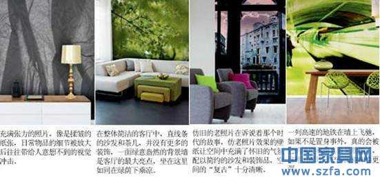 一、用 “ 模仿 ” 提升樂(lè)趣 性價(jià)比指數(shù): ★★★☆☆ 玩 “ 墻 ” 指數(shù): ★★★★☆ 視覺(jué)沖擊指數(shù): ★★★★★ 隨著各種 “ 模仿 ” 秀的不斷升級(jí),壁紙也緊跟時(shí)尚的腳步, 1 仿照片效果的壁紙帶來(lái)了強(qiáng)烈的視覺(jué)沖擊力,把空間的裝飾效果推上頂點(diǎn)。 打造要點(diǎn):局部裝飾 + 具象圖案 整體效果:仿照片效果的壁紙跟以往的照片裝飾有所不同,用整面墻去訴說(shuō)一個(gè)主題,給人帶來(lái)的是超乎尋常的視覺(jué)震撼,用這樣的壁紙作為房間的背景, 1 其它的家什似乎都黯淡了下來(lái),或者說(shuō),不用特別地精心布置,擁有仿照片效果的大氛圍已經(jīng)注定了這樣的空間會(huì)不同尋常,仿照片效果的壁紙通常采用局部鋪貼的手法,因?yàn)椋植康难b點(diǎn)已經(jīng)可以給空間帶來(lái)足夠的影響力,仿照片效果壁紙的 “ 照片 ” 內(nèi)容十分具象,建筑、人物、花草 …… 但逼真的程度足以以假亂真,讓人同時(shí)體驗(yàn)著壁紙與影像帶來(lái)的空間樂(lè)趣。