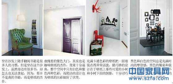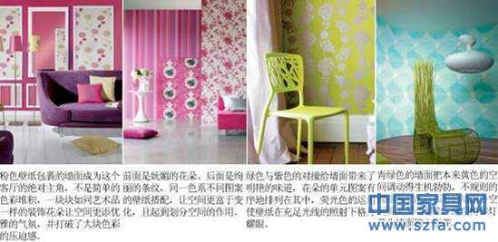 二、用絢爛打破平淡 性價(jià)比指數(shù): ★★★☆☆ 玩 “ 墻 ” 指數(shù): ★★★★☆ 視覺(jué)沖擊指數(shù): ★★★★☆ 作為大面積鋪貼的壁紙,時(shí)常在空間中扮演打底的角色,需要怎樣的整體氣氛當(dāng)然要由色彩來(lái)說(shuō)話,絢麗的色彩可以給空間帶來(lái)活躍和動(dòng)感的氛圍, 1 不同的色彩可以詮釋不同的空間熱度,有 90 度熱情的紅色, 80 攝氏度熱情的橙色,更有各種亮眼的色彩碰撞在一起的百分百熱情,你的熱情有幾度呢? 打造要點(diǎn):絢麗色彩 + 花紋點(diǎn)綴 整體效果:壁紙的色彩十分廣泛,不同材質(zhì)的壁紙可以產(chǎn)生不同的色彩氛圍和質(zhì)感,紙基壁紙和 PVC 壁紙比較普遍,色彩眾多,容易清潔;而織物壁紙和植物壁紙?jiān)诹Ⅲw感的塑造上比紙基壁紙要略勝一籌,但是清潔起來(lái)比較麻煩,凹凸紋理的細(xì)節(jié)需要在保養(yǎng)上下一番工夫;其它的壁紙, 1 如金屬壁紙、熒光壁紙可以產(chǎn)生一些特殊的效果來(lái)裝點(diǎn)房間。和絢麗色彩相映成趣的當(dāng)然是壁紙上的圖案,最常見(jiàn)的使用方法是在整體氛圍確定后,以局部點(diǎn)綴一些帶有花紋的裝飾圖案,把人的視覺(jué)重點(diǎn)自然地過(guò)渡到帶有圖案的墻面上,令鮮亮的色彩和各種圖案完美地融合在一起。