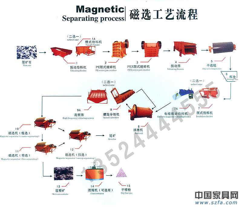鐵礦選礦設(shè)備,開采的礦石先由顎式破碎機進行初步破碎,在破碎至合理細度后經(jīng)由提升機、給礦機均勻送入球磨機,由球磨機對礦石進行粉碎、研磨。經(jīng)過球磨機研磨的礦石細料進入下一道工序:分級。螺旋分級機借助固體顆粒的比重不同而在液體中沉淀的速度不同的原理,對礦石混合物進行洗凈、分級。經(jīng)過洗凈和分級的礦物混合料在經(jīng)過磁選機時,由于各種礦物的比磁化系數(shù)不同,經(jīng)由磁力和機械力將混合料中的磁性物質(zhì)分離開來。經(jīng)過磁選機初步分離后的礦物顆粒在被送入浮選機,根據(jù)不同的礦物特性加入不同的藥物,使得所要的礦物質(zhì)與其他物質(zhì)分離開。在所要的礦物質(zhì)被分離出來后,因其含有大量水分,須經(jīng)濃縮機的初步濃縮,再經(jīng)烘干機烘干,即可得到干燥的礦物質(zhì)。