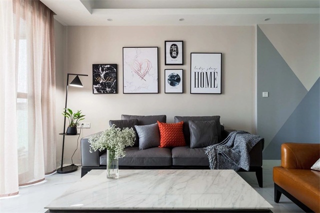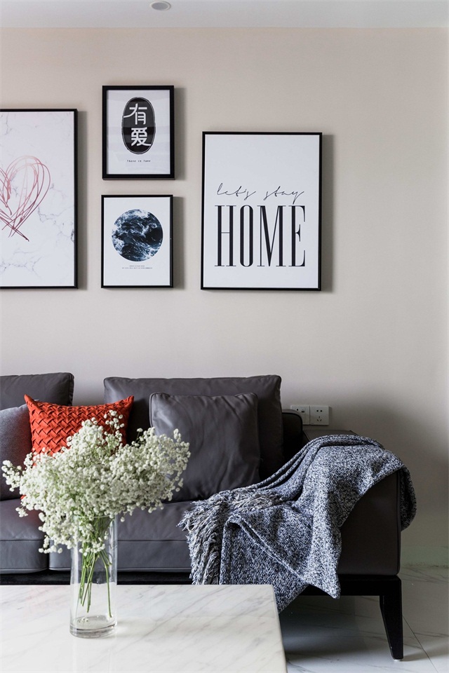 沙發(fā)背景墻選用最簡(jiǎn)單的掛畫方式點(diǎn)綴,簡(jiǎn)約大方。