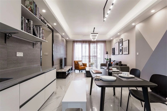 現(xiàn)代風(fēng)格以灰色為基調(diào),橙色沙發(fā)和抱枕讓整個(gè)空間看起來(lái)不那么壓抑;電視墻采用1200x600磚上墻,配合黑白烤漆電視柜,使整個(gè)客廳的空間顯得寬闊和大氣。