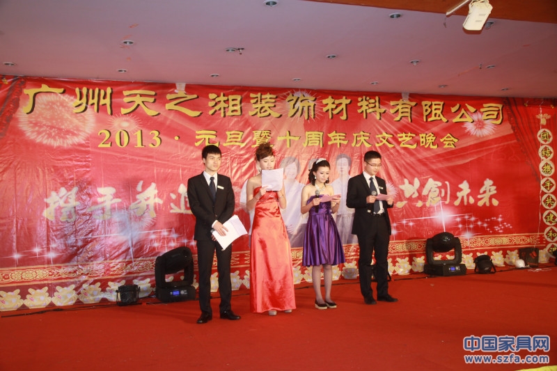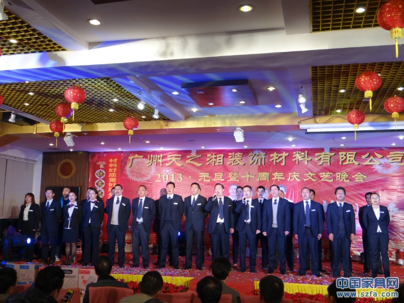 2012年12月30日下午14:00-18:00在名駿海鮮酒家廣州天之湘裝飾材料有限公司隆重舉辦10周年慶典及文藝晚會(huì)。天湘員工300多人加上供應(yīng)商一起有400多人參加本次晚會(huì)。