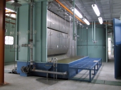 噴漆時(shí),外部空氣經(jīng)過初級過濾網(wǎng)過濾后由風(fēng)機(jī)送到房頂,再經(jīng)過頂部過濾網(wǎng)二次過濾凈化后進(jìn)入房內(nèi)。房內(nèi)空氣采用全降式,以0.2-0.3m/s的速度向下流動,使噴漆后的漆霧微粒不能在空氣中停留,而直接通過底部出風(fēng)口被排出房外。這樣不斷地循環(huán)轉(zhuǎn)換,使噴漆時(shí)房內(nèi)空氣清潔度達(dá)98%以上,且送入的空氣具有一定的壓力,可在車的四周形成一恒定的氣流以去除過量的油漆,從而最大限度地保證噴漆的質(zhì)量。
