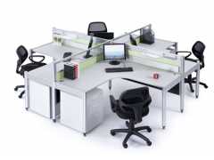 四人組合位:灰白色臺(tái)面,屏風(fēng)為銀色鋁材,通柱直徑55mm,果綠色板與黑色鋼板組合,側(cè)面帶掛件板,