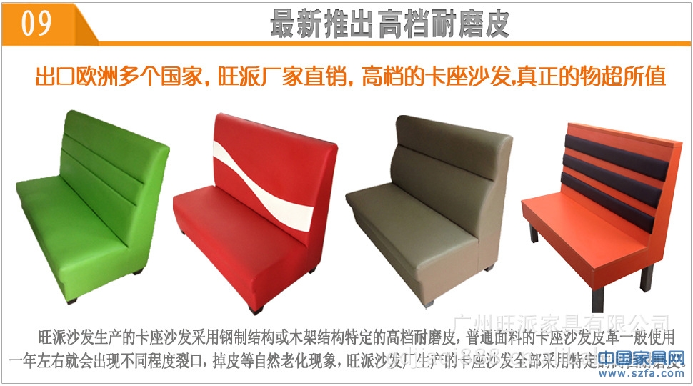 1、最新推出高檔耐磨皮:旺派沙發(fā)生產(chǎn)的卡座沙發(fā)采用鋼制結(jié)構(gòu)或木制結(jié)構(gòu)特定的高檔耐磨皮,普通面料的皮革卡座沙發(fā)皮革一般使用一年左右就會(huì)出現(xiàn)不同程度裂口,掉皮等自然老化現(xiàn)象,旺派沙發(fā)廠生產(chǎn)的卡座沙發(fā)全部采用特定的高檔耐磨皮,經(jīng)驗(yàn)證:用鎖匙刮過(guò)后都不會(huì)出現(xiàn)裂口,刮痕,如果您有需要我們可以免費(fèi)為您寄過(guò)皮樣色卡,您收到皮樣后您可以同普通皮革作對(duì)比(郵寄費(fèi)由買(mǎi)方支付)