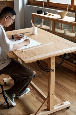 “坐在這張具有經(jīng)典工業(yè)風(fēng)氣度的桌前,儼然成為一位充滿浪漫的藝術(shù)家,或者是嚴(yán)謹(jǐn)?shù)睦L圖員。無論是平放辦公、傾斜閱讀,或是繪圖和創(chuàng)作都可以不受束縛。”
