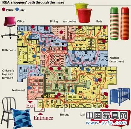 據(jù)英國《每日郵報》報道,商店設計專家稱,宜家“迷宮式”的商場布局是一種心理武器,在盡可能長時間留住顧客的同時還從心理上迫使消費者進行沖動消費,購買更多的商品。