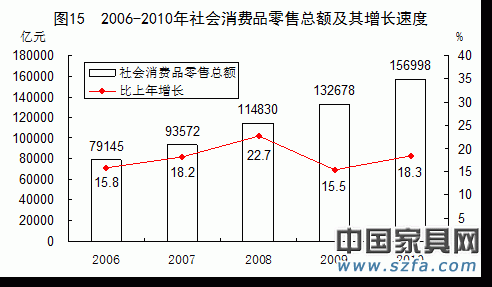全年社會消費品零售總額156998億元,比上年增長18.3%,扣除價格因素,實際增長14.8%。按經(jīng)營地統(tǒng)計[8],城鎮(zhèn)消費品零售額136123億元,增長18.7%;鄉(xiāng)村消費品零售額20875億元,增長16.2%。按消費形態(tài)統(tǒng)計,商品零售額139350億元,增長18.4%;餐飲收入額17648億元,增長18.1%。