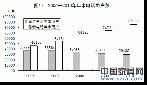 全年完成郵電業(yè)務總量[9]32940億元,比上年增長20.6%。其中,郵政業(yè)務總量1985億元,增長21.6%;電信業(yè)務總量30955億元,增長20.5%。全年局用交換機容量減少2707萬門,總?cè)萘?6559萬門;新增移動電話交換機容量[10]6433萬戶,達到150518萬戶。固定電話年末用戶29438萬戶。其中,城市電話用戶19662萬戶,農(nóng)村電話用戶9776萬戶。新增移動電話用戶11179萬戶,年末達到85900萬戶。其中,3G移動電話用戶[11]4705萬戶。年末全國固定及移動電話用戶總數(shù)達到115339萬戶,比上年末增加9244萬戶。電話普及率達到86.5部/百人?;ヂ?lián)網(wǎng)上網(wǎng)人數(shù)4.57億人,其中寬帶上網(wǎng)人數(shù)4.50億人;互聯(lián)網(wǎng)普及率達到34.3%。