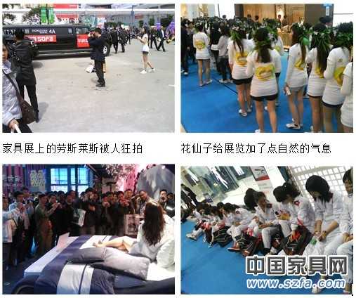 三個家具展覽的廠家?guī)缀醵加糜≈聘髯云放频馁徫锎樱?dāng)然美女駐場是百試把靈的吸引觀者的花招。沙發(fā)美女、軟床美女、餐桌美女……一群群好攝之徒包圍著這個展館,讓過道瞬間“堵車”。