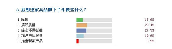 此外,對于下半年,網(wǎng)友也寄予了良好的愿望。網(wǎng)友最希望家具品牌做的事情是——提高產(chǎn)品質(zhì)量,投票數(shù)占29.4%。其次是提高環(huán)保標準,占27.5%,第三位是加強售后服務(wù),占19.6%,第四位是降價,占17.6%,第五位是推出新款產(chǎn)品,占5.9%。