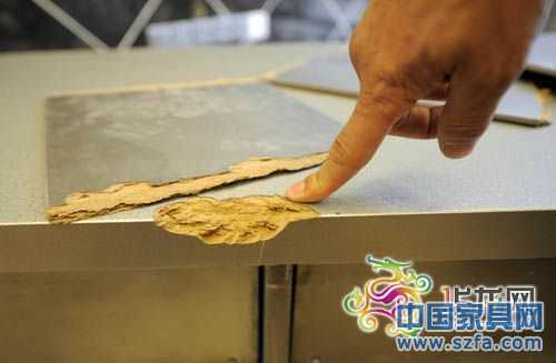 “我要的是實木的,訂單合同上也寫的是櫻桃木,實際上卻是中纖板,這不是玩弄消費者嘛?。?rdquo;韋先生說著,用小刀割開家具表面給記者看,電視柜的面板、底板及隔板內(nèi)部,確實不是實木,而是像紙殼一樣的物質(zhì),而韋先生拿出的合同上主材一欄明確寫著“櫻桃木”,輔材一欄則是空白。