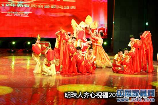 2012年1月18日下午2點,掌上明珠家具2012年新春晚會暨頒獎盛典 “前線歡樂匯”在成都市崇州藝術中心劇場精彩上演。全體后勤員工、2011年年度先進人物以及市場一線人員家屬歡聚一堂,一千余人共迎新春佳節(jié)。整臺晚會由精心構思的節(jié)目和現(xiàn)場頒獎組成,或輕松或感人的視頻穿插其中,構思精巧,氣氛熱烈,洋溢著濃濃的激情與無限歡樂。