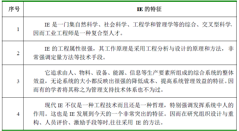 IE受到工業(yè)界的普遍重視,其原因就是因?yàn)樗苯用嫦蚱髽I(yè)的生產(chǎn)運(yùn)作過程,并與數(shù)學(xué)、人因?qū)W、經(jīng)濟(jì)管理和各種工程技術(shù)有著密切的關(guān)系。IE以系統(tǒng)工程為哲理,以運(yùn)籌學(xué)等數(shù)學(xué)方法為理論基礎(chǔ),以現(xiàn)代信息技術(shù)為工具,用工程量化的分析方法對(duì)包括制造業(yè)、服務(wù)業(yè)在內(nèi)的由人、物料、設(shè)備、能源、信息等多種因素所組成的各種復(fù)雜的企業(yè)或組織系統(tǒng)中的實(shí)際工程與管理問題,進(jìn)行定量、系統(tǒng)的分析、設(shè)計(jì)與優(yōu)化,從而實(shí)現(xiàn)系統(tǒng)的最大效率和效益。IE是唯一一門以系統(tǒng)效率和效益為目標(biāo)的工程技術(shù),因此成為其他工程所不能替代、同時(shí)又對(duì)其他工程互補(bǔ)性很強(qiáng)的一項(xiàng)綜合性邊緣學(xué)科。