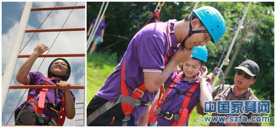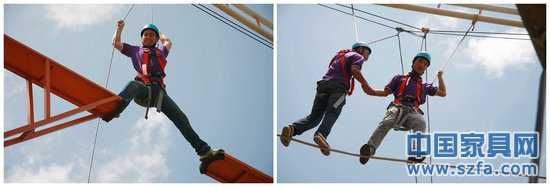 戶外拓展項(xiàng)目“天使之手”、“獨(dú)木橋”——穿戴安全措施的學(xué)員攀爬上9米的高空,獨(dú)立或合作完成項(xiàng)目,其他隊(duì)員在地面做拉鎖保護(hù)。尊典的伙伴們正在拓展教練的指導(dǎo)下認(rèn)真穿戴安全衣帽,攀爬上高空機(jī)械。此項(xiàng)目能幫助學(xué)員克服心理恐懼,鍛煉膽量,增強(qiáng)自信,提高團(tuán)隊(duì)配合度。