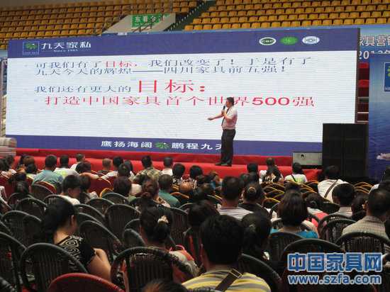 2012年7月4日,第二屆中國(guó)家具高峰論壇暨九天家私2012商務(wù)年會(huì)在成都市雙流體育館隆重舉行,本次會(huì)議記者以對(duì)話嘉賓身份出席——不靠近不知道,一靠近卻感受到了足夠的震撼:一是九天已經(jīng)是“中國(guó)馳名商標(biāo)”,這是川企少有的殊榮,屈指一數(shù)不到十個(gè);二是九天將自己定位于“四川家具前五強(qiáng)”,而這需要多大的自信與魄力。據(jù)介紹“2009年,影視皇帝張國(guó)立先生攜手代言九天家私,出任名譽(yù)董事長(zhǎng)世界500強(qiáng)企業(yè)高管丁驥先生(海歸雙碩士)入主九天,開(kāi)啟新的征程。2010銷(xiāo)售從4000萬(wàn)增至2億,進(jìn)入中國(guó)家具億元俱樂(lè)部,2011年引進(jìn)行業(yè)頂尖級(jí)策劃及爆破專(zhuān)家和團(tuán)隊(duì),銷(xiāo)售劇增至4.5億,增速行業(yè)第一,2012 銷(xiāo)售目標(biāo)8億。”