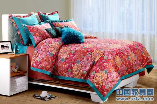 這是一款濃烈色調(diào)的床品,鮮艷的紅與飽和的孔雀藍色的激情碰撞,大膽撞色演繹濃郁的西域風情,如此完美搭配卻不覺沖突。經(jīng)典佩斯利紋在不同層次的紅色背景映襯下,使這款產(chǎn)品擁有精美的紋路與張揚的風格,異國情調(diào)盡顯無疑。
