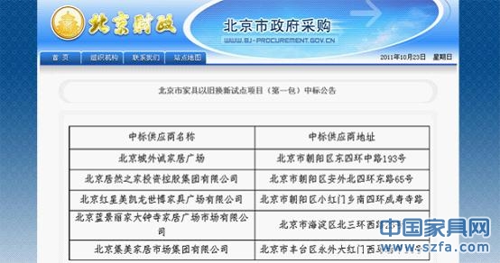 10月15日,中國政府采購網(wǎng)公布了北京市商務(wù)委員會北京市家具以舊換新試點(diǎn)項(xiàng)目中標(biāo)結(jié)果,居然之家成功中標(biāo)項(xiàng)目第一包(項(xiàng)目編號:BJJQ-2012-281-01 ),成為首批以舊換新的家具銷售定點(diǎn)供應(yīng)商。