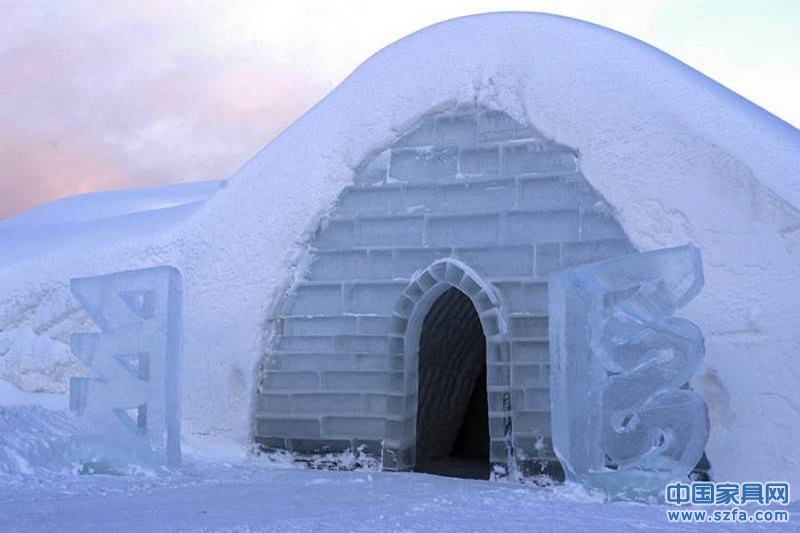 芬蘭雪村酒店的入口。每年的11月末,雪村都會重建,耗費大約1000輛卡車雪。