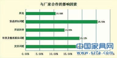 在影響與廠家合作的因素中,貨品折扣是經(jīng)銷商最關(guān)心的,這與消費者進店購買家具是一個理,消費者希望拿到性價比高的產(chǎn)品,同樣經(jīng)銷商也希望從廠家拿到最低折扣的產(chǎn)品。在補貨及售后服務(wù)以及發(fā)貨問題上分別有19.15%和18.09%的經(jīng)銷商選擇,也不乏一些經(jīng)銷商抱怨廠家的發(fā)貨不及時以及產(chǎn)品更新周期長。但是在調(diào)研過程中,大部分經(jīng)銷商都表示與廠家之間的大部分時候合作的很愉快。但是也有一些廠家在經(jīng)銷商加盟拿貨后采取放任自流式的態(tài)度。