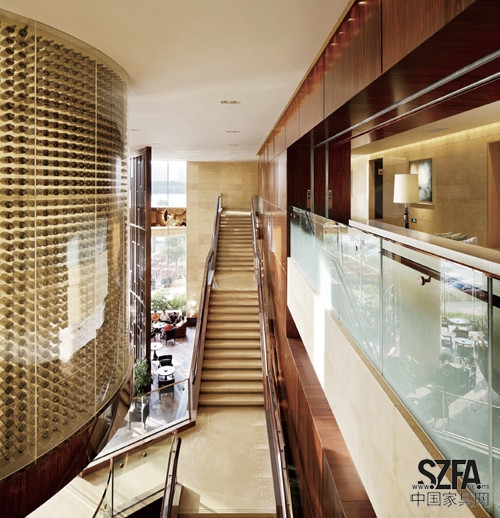 酒店大堂挑高17米,為避免大面積深色的壓抑感,采用大量弧線及圓形作為空間的區(qū)隔和裝飾。從天花垂直而下的圓柱形酒塔與圓形樓梯接口及大堂吧臺對應(yīng),既增添了豐富感,也構(gòu)成了這個高尺度空間的視覺主線。