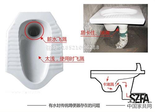 無論什么牌子的蹲便器,所謂的“名牌”,即使是黃金做的,沒有革命性的技術(shù)突破,沒有先進(jìn)的連接管件配套、安裝不規(guī)范、而是作為裝飾擺設(shè)性安裝,談不上是任何功能系統(tǒng),跑、冒、滴、漏、臭、堵、卡、費(fèi)水、費(fèi)工、費(fèi)料、施工難、維修難,眾所周知,給用戶帶來諸多的不便和麻煩。而且傳統(tǒng)蹲便器的排污口都開設(shè)在蹲便器的下方(底部)分為有水封和無水封二種,有水封的蹲便器水封存水裸露,使用時容易飛濺,骯臟。特別是由于存水彎在設(shè)計、生產(chǎn)工藝上的致命缺陷(反方向S型)就造成排水不暢,最容易堵塞。一旦堵塞,很難疏通,而且要有相當(dāng)大的水量沖洗才能使用,極度費(fèi)水!
