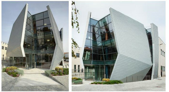 Paolo Dellapiana為一個(gè)辦公室設(shè)計(jì)了形狀別致的“殼”型建筑,用不透明的外墻、不規(guī)則的裂縫和玻璃共同組合而成,通過大樓建筑來表現(xiàn)現(xiàn)代印刷技術(shù)的水平。外殼的顏色是中度灰,會根據(jù)天空和陽光而反射改變顏色,是當(dāng)?shù)匾坏懒聋惖娘L(fēng)景。