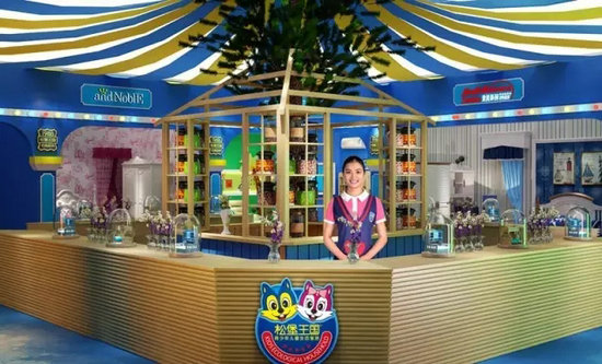 以“北歐松木森林里的春天”為設(shè)計背景,采用北歐松木材料搭建的一座對稱式城堡,從遠(yuǎn)處望去,城堡屋頂?shù)难┱谌芑?,紫藤吊蘭和梨花已經(jīng)艷麗盛放,松堡王國吉祥物“安安”和“全全”松鼠雕像已經(jīng)站在門口正在迎接來自世界各地的游客們,城堡下停放著的雪橇車,雪橇車?yán)镅b著最有特色的食物和玩具;進(jìn)入展區(qū)的中心是交流和服務(wù)區(qū),通透的頂部以一顆松樹為中心,采用藍(lán)色和黃色組成的彩帶向四周展開,在溫暖的燈光照射下,讓整個展位顯得快樂和舒適……