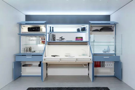 工作臺與臥床無縫切換的設計可謂技驚四座,沉穩(wěn)工作的氣氛一秒切換成休閑娛樂的場所,將空間的簡約利用發(fā)揮到極致。
