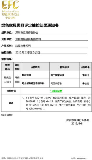 5月的“中國(guó)綠色家具優(yōu)品”抽檢,深圳路福寢具有限公司抽檢合格率再次達(dá)到100%,連續(xù)五個(gè)月抽檢合格,堪稱(chēng)健康寢具品質(zhì)標(biāo)桿企業(yè)。