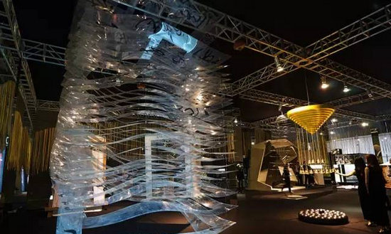 在“心+設(shè)計(jì)學(xué)社”展位里,擺放著12位設(shè)計(jì)師各自帶著對(duì)東方文化的理解和感悟而制作而成的充滿東方美學(xué)與中國(guó)文化的展品。圖中是邱春瑞大師以點(diǎn)線為基礎(chǔ)設(shè)計(jì)而成的作品,通過(guò)視覺(jué)轉(zhuǎn)換呈現(xiàn)出不一樣的空間效果,搭建成一個(gè)充滿生命變化,時(shí)間變化的空間。