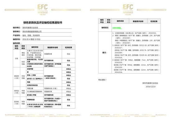 12月23日,中國綠色家具優(yōu)品2016年四季度10月份抽檢工作完成。德勝家具本月質(zhì)量抽檢再次順利通過深圳家具研究開發(fā)院檢測中心賽德檢測的嚴(yán)格檢驗,成品沙發(fā)及原輔材料品質(zhì)均高出國家標(biāo)準(zhǔn)。