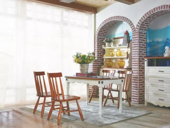 在空間色彩運(yùn)用上,天、地、墻大面積淺色系顏色的搭配組合,讓整體空間格調(diào)相對統(tǒng)一,通透明亮。而不同肌理的材質(zhì)如:仿古瓷磚、造型漆以及原始紅磚元素的運(yùn)用,往往投射著極其濃郁的鄉(xiāng)村氣息。精心布局的窗簾、燈飾、裝飾品等空間軟硬件,則是運(yùn)用了綠色、橙色、藍(lán)色等充滿自然氣息的色彩,讓家居空間更加自然清新、生機(jī)盎然。