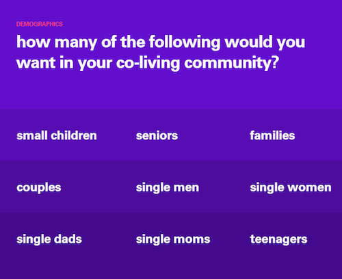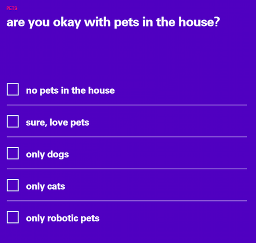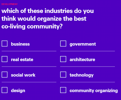 One Shared House 2030 在線平臺由 Space10 與布魯克林設(shè)計(jì)工作室 Anton&Irene 合作創(chuàng)建,網(wǎng)站邀請用戶填寫一份問卷,問卷從通勤、個(gè)性化、家具和寵物等21個(gè)主題展開調(diào)查,部分問題如下: