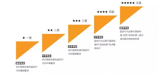 品質(zhì)星級(jí)評(píng)定,共分為六大等級(jí)標(biāo)準(zhǔn),最低1星標(biāo)準(zhǔn),參展商需提供符合國家標(biāo)準(zhǔn)的家具成品1頻次和關(guān)鍵原材料1頻次送檢的檢測(cè)報(bào)告,次高5星標(biāo)準(zhǔn),由專業(yè)的第三方檢測(cè)機(jī)構(gòu)對(duì)企業(yè)的品質(zhì)控制體系進(jìn)行全面審核,并以高于國家標(biāo)準(zhǔn)的歐盟標(biāo)準(zhǔn)對(duì)關(guān)鍵原材料及成品進(jìn)行嚴(yán)格抽檢,最高為5星+中國綠色家具優(yōu)品標(biāo)準(zhǔn),參展企業(yè)必須達(dá)到中國綠色家具優(yōu)品的各項(xiàng)要求。即是中國綠色家具優(yōu)品作為深圳展最高的參展標(biāo)準(zhǔn),在展會(huì)層面激勵(lì)、推動(dòng)所有參展商向更高標(biāo)準(zhǔn)、更高品質(zhì)邁進(jìn),以持續(xù)提升中國家具的品牌形象和價(jià)值。