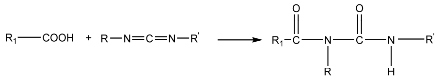 碳化二亞胺可與-COOH反應形成交聯,可作為水性涂料的交聯劑,反應式如下。