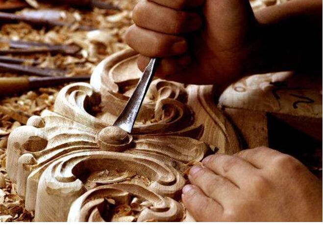 除了令人嘖嘖稱奇的榫卯工藝,雕刻工藝,也是紅木家具中最見真功夫的一道工序,它共要經(jīng)歷五個步驟,從“原坯拓樣”、“紋樣粗鑿”、“精工鏟雕”、“輪廓修飾”到“修磨處理”每一個步驟都需要極大的耐性,每一個動作都要謹小慎微,匠人們手上的力道一定要拿捏的恰到好處,否則一不小心就會給整個家具帶來不可逆的瑕疵。