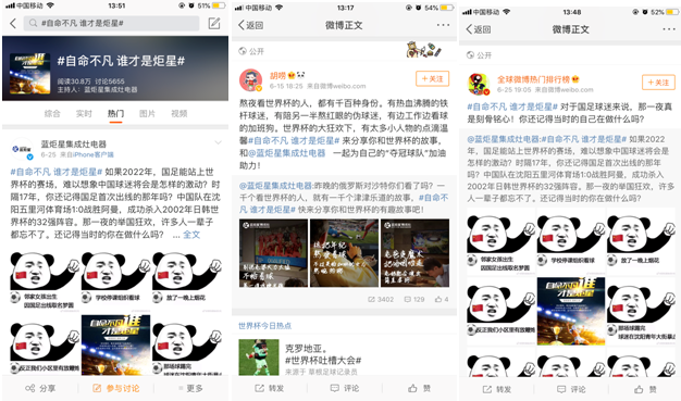 世界杯對(duì)于像藍(lán)炬星集成灶這樣做廚房電器的品牌來說,本是個(gè)不容易結(jié)合的營(yíng)銷節(jié)點(diǎn),但是藍(lán)炬星集成灶準(zhǔn)確地洞察了世界杯看球人群的心理動(dòng)向和情感需求點(diǎn),很好地將兩者結(jié)合,并取得了不錯(cuò)的營(yíng)銷效果。由藍(lán)炬星集成灶發(fā)起的微博話題“自命不凡 誰才是炬星”閱讀量超過30萬,討論量達(dá)到5600+,實(shí)際效果也相當(dāng)不錯(cuò)。