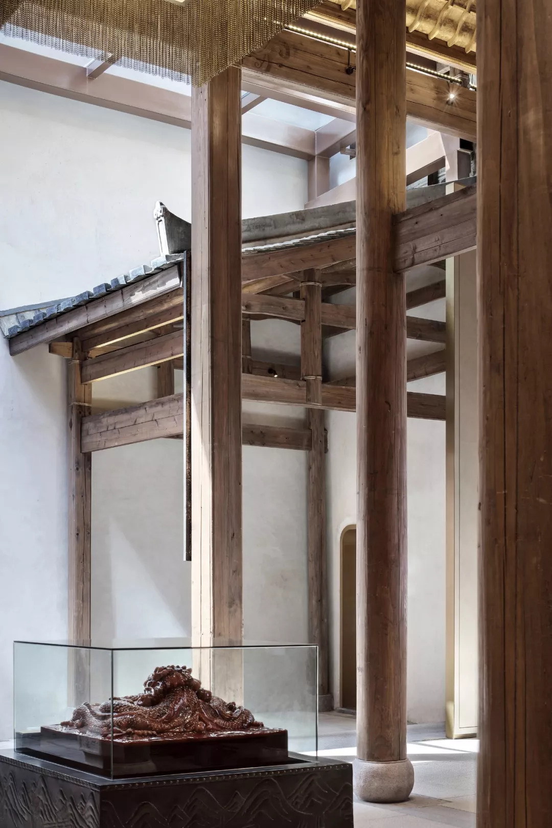 歷史文物古建的木制架構(gòu),古樸不乏清雅的木色,因?yàn)榻?rùn)了歲月光陰,更顯溫潤(rùn)親切。設(shè)計(jì)巧妙地讓古舊的木建筑元素自然嵌合進(jìn)空間,這些老而不頹的木頭以極具藝術(shù)氣息的形態(tài)豐盈著空間的精神界域,在淡雅安然的背景映襯之下,煥發(fā)出嶄新的生命活力。
