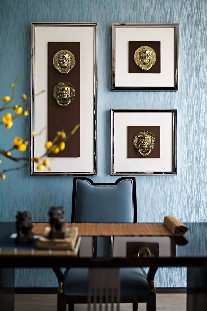 簡(jiǎn)化改良版的中式書桌椅,散發(fā)著清雅氣質(zhì)之美,背后的組合裝飾畫更是別出心裁,畫中的獸首門環(huán),商周銅飾中早已有之。