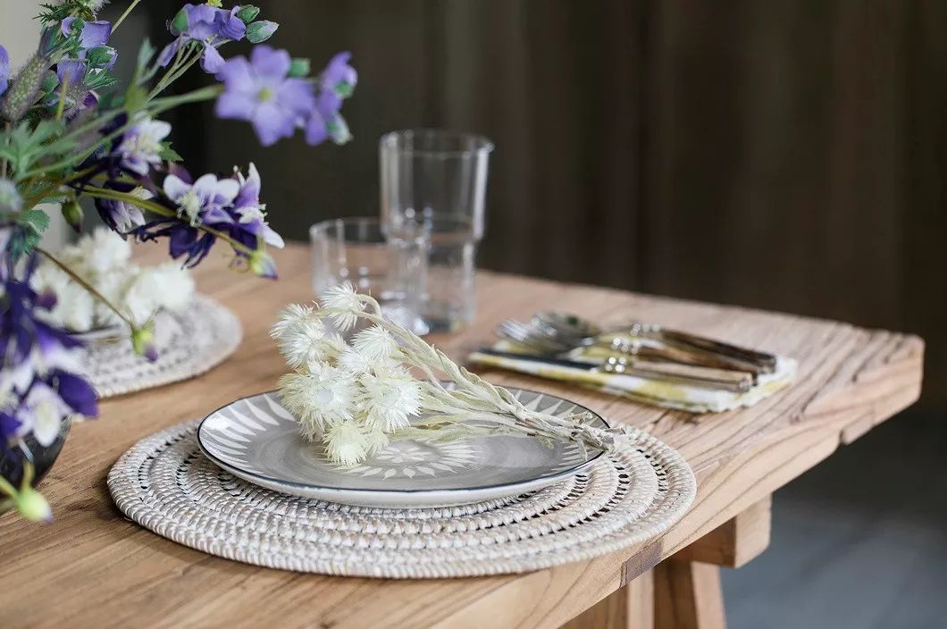 用餐區(qū)位于客廳一隅,窗外便是幾株青翠修竹,棕色原木桌上擺放著沉靜清恬的紫花,黑色的組合圓形圖案,讓空間的表現(xiàn)力更顯豐盈。