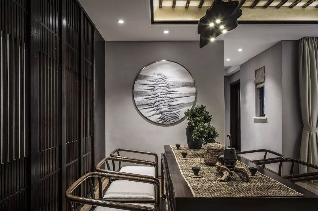 硬裝布局以“開放、包容”的生活態(tài)度為至上,不止客廳設(shè)計(jì)左右雙向門窗,開放式餐廳,也瞬間拉近了心理上的距離,傳統(tǒng)的中式餐桌椅,搭配飽含東方韻味的圓形水墨畫,以及編織感桌墊與擺件,人文墨客推杯換盞的隱居生活畫面,悠然而愜意!